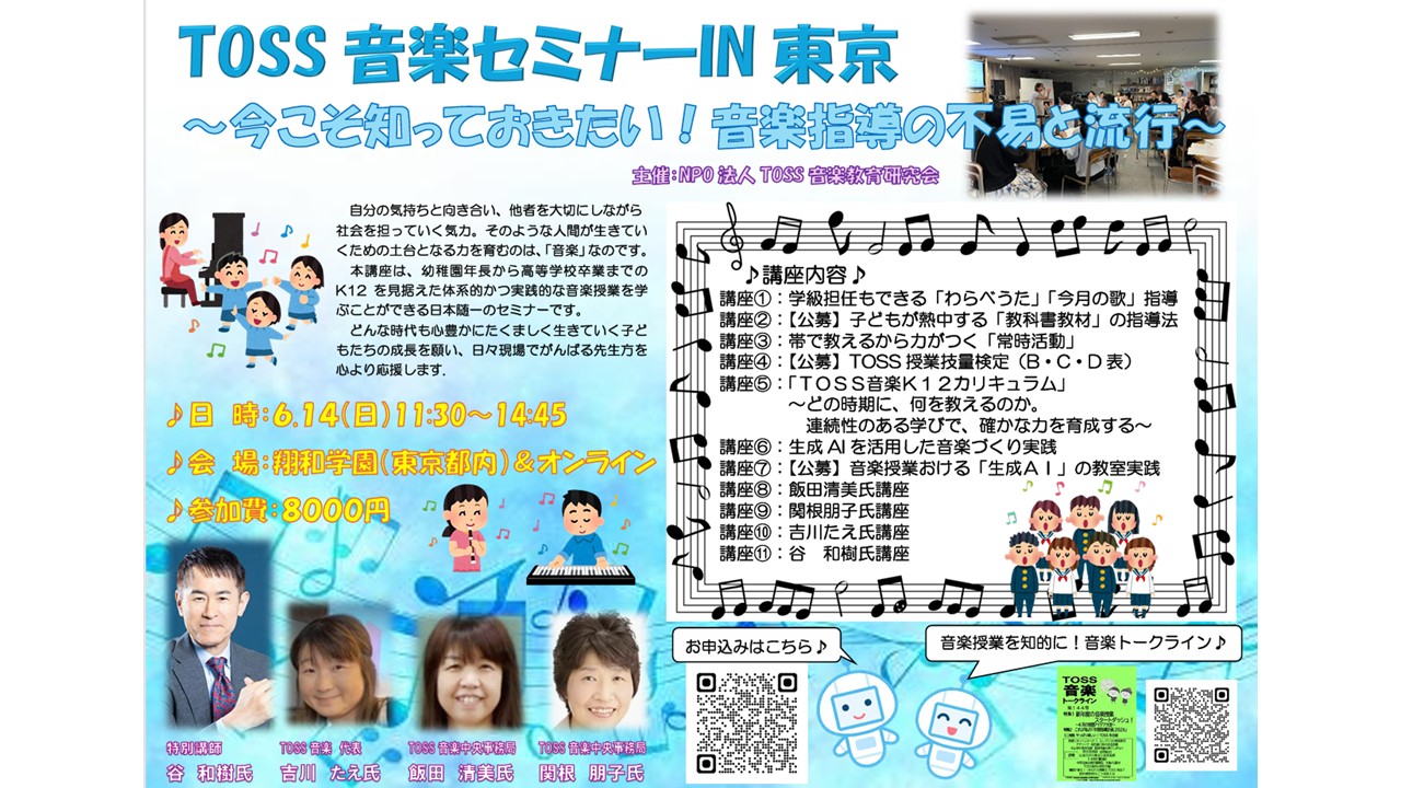 AI時代になった今、音楽教育を通し、子供たちにどのような力を育てていくのか。TOSS音楽の提案をもとに、参加者の皆様と考…
